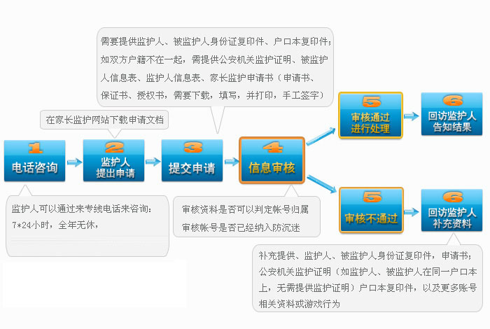 未成年保护协议 “网络游戏未成年人家长监护工程”是一项由完美时空、盛大、腾讯、网易、搜狐畅游、巨人六家网络游戏企业共同发起并参与实施,由中华人民共和国文化部 指导,旨在加强家长对未成年人参与网络游戏的监护,引导未成年人健康、绿色参与网络游戏,和谐家庭关系的社会性公益行动。“家长监护机”制针对目前未成年人缺乏自控及自律能力,容易陷入沉迷;少数监护人缺少时间照顾孩子,不能及时监督孩子游戏时间的现状,而推出的一种可由家长实施监控,纠正部分未成年子女沉迷游戏的保护机制。 供申请监督方式: A. 屏蔽账号:根据监护人意愿屏蔽相关游戏应用登陆。 B. 账号动态监控:登陆、修改密码等操作将发短信至监护人手机。 1)账号已经有认证手机的,将监护人手机替换为认证手机; 2)账号未认证手机,将监护人手机绑定成认证手机; 其他要求: 1.申请人应提交较完备的申请材料,对未提供的信息要及时补充;可请熟知电脑、互联网、游戏的人员进行协助,以便提供详实资料; 2.申请人应保证提交的信息真实有效;对于提供虚假信息或伪造证件,我司将保留进一步追究法律责任的权利。 申请条件: 1、 申请人需为被监护未成年人的法定监护人; 2、 申请人的被监护人年龄小于18周岁; 3、 申请人需为大陆公民,不含港、澳、台人士。 申请需提交材料: 1、监护人信息表(包含监护人的身份证明复印件); 2、被监护人信息表(包含被监护人所玩游戏相关信息及身份证明复印件); 3、填写网络游戏未成年人家长监护申请书、保证书、授权书并手工签字(需下载,填写并打印,签字); 4、申请人与被监护人的监护关系证明文件(户口簿或有关机关出具的证明文件) 申请方式: 1.电话服务 监护人可以通过来专线电话来咨询,7*24小时,全年无休,专线:13608212022(资深客服解答)。 2.接待服务 监护人可以直接上门进行申请,接待服务受理时间7*8小时(9:30—17:15),全年无休, 接待地址:中国(四川)自由贸易试验区成都高新区吉泰路10号3栋24层2401号(自编号006) 其他要求: 1.申请人应提交较完备的申请材料,对未提供的信息要及时补充;可请熟知电脑、互联网、游戏的人员进行协助,以便提供详实资料; 2.申请人应保证提交的信息真实有效;对于提供虚假信息或伪造证件,我司将保留进一步追究法律责任的权利。